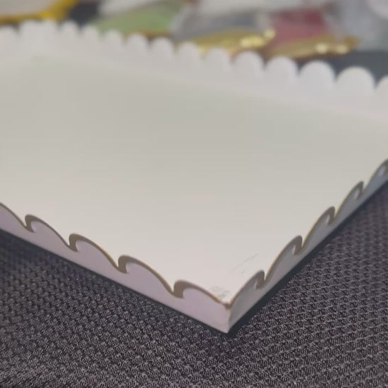 Add a touch of elegance to your home with our metal tray! Featuring a shiny gold trim, this tray is not only decorative but also functional. Perfect for serving drinks or displaying decorative items, our tray is a must-have for any stylish household.